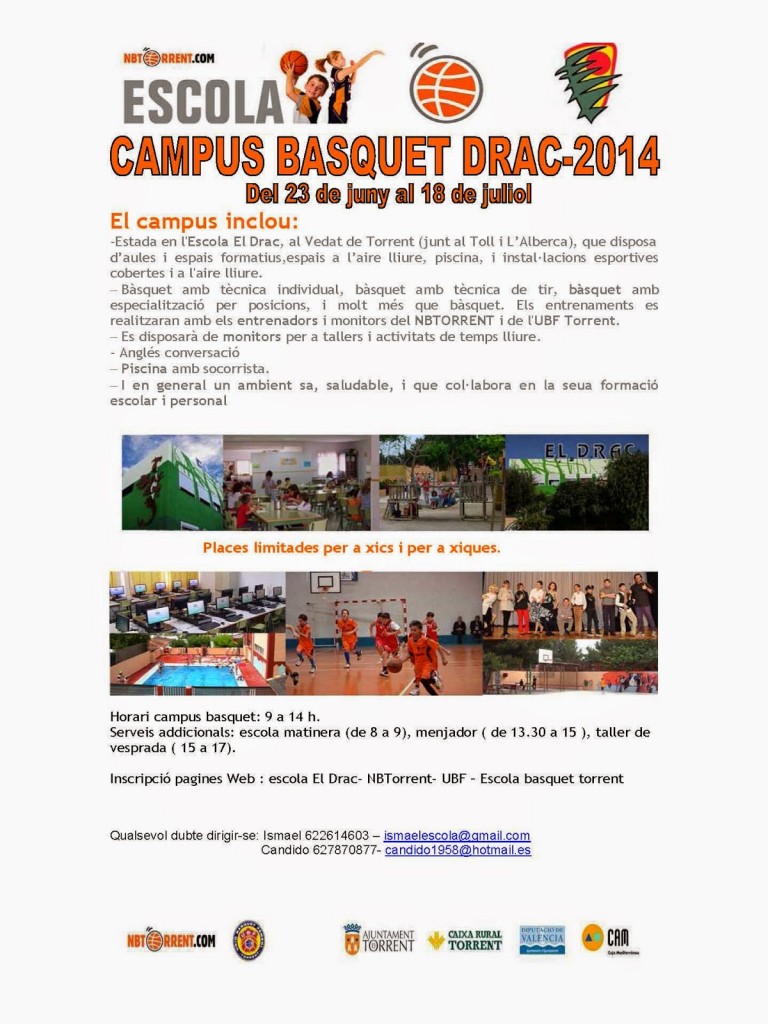 Los clubs de basquet de torrent y la escuela , ponen en marcha por tercer año consecutivo elcampus de verano de basquet en la escola el drac, donde teniendo como eje central la práctica del baloncesto no olvidamos otras facetas como los deberes, y una parte más lúdica que incluye, ingles, manualidades, piscina.