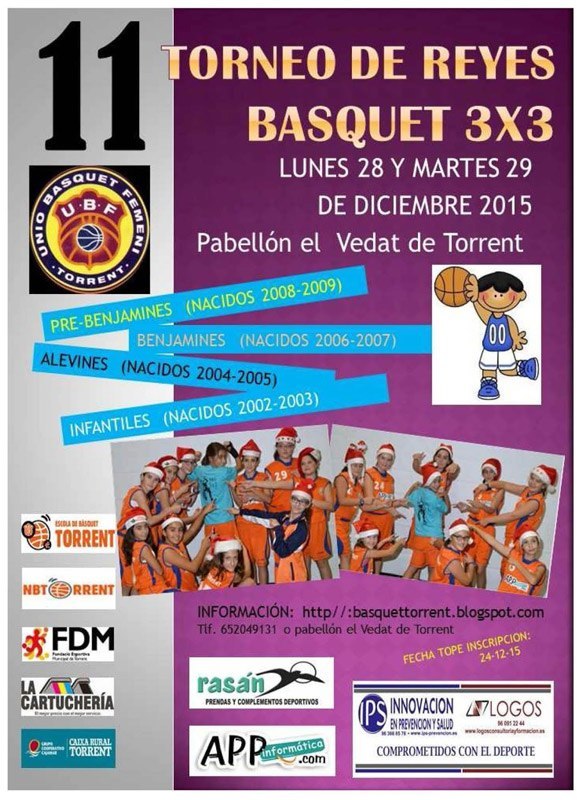 Nos complace anunciaros que los próximos 28 y 29 de Diceimbre de 2015 (lunes y martes) celebraremos el el Pabellón el Vedat de Torrent el 11º Torneo de Reyes 3×3, organizado por el Unió Bàsquet Femení de Torrent y con la colaboración del Nou Bàsquet Torrent y la Escola de Bàsquet Torrent.